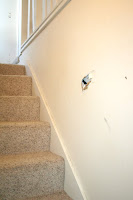 Well, hubby tripped going up stairs last fall and made a hole with his shoulder or head or something (This is not the first time he has made holes in things just by walking, I've lost track on how he did this one, don't worry, we don't visit china shops). And I've been lazy and putting off pulling out the joint compound just to patch this.